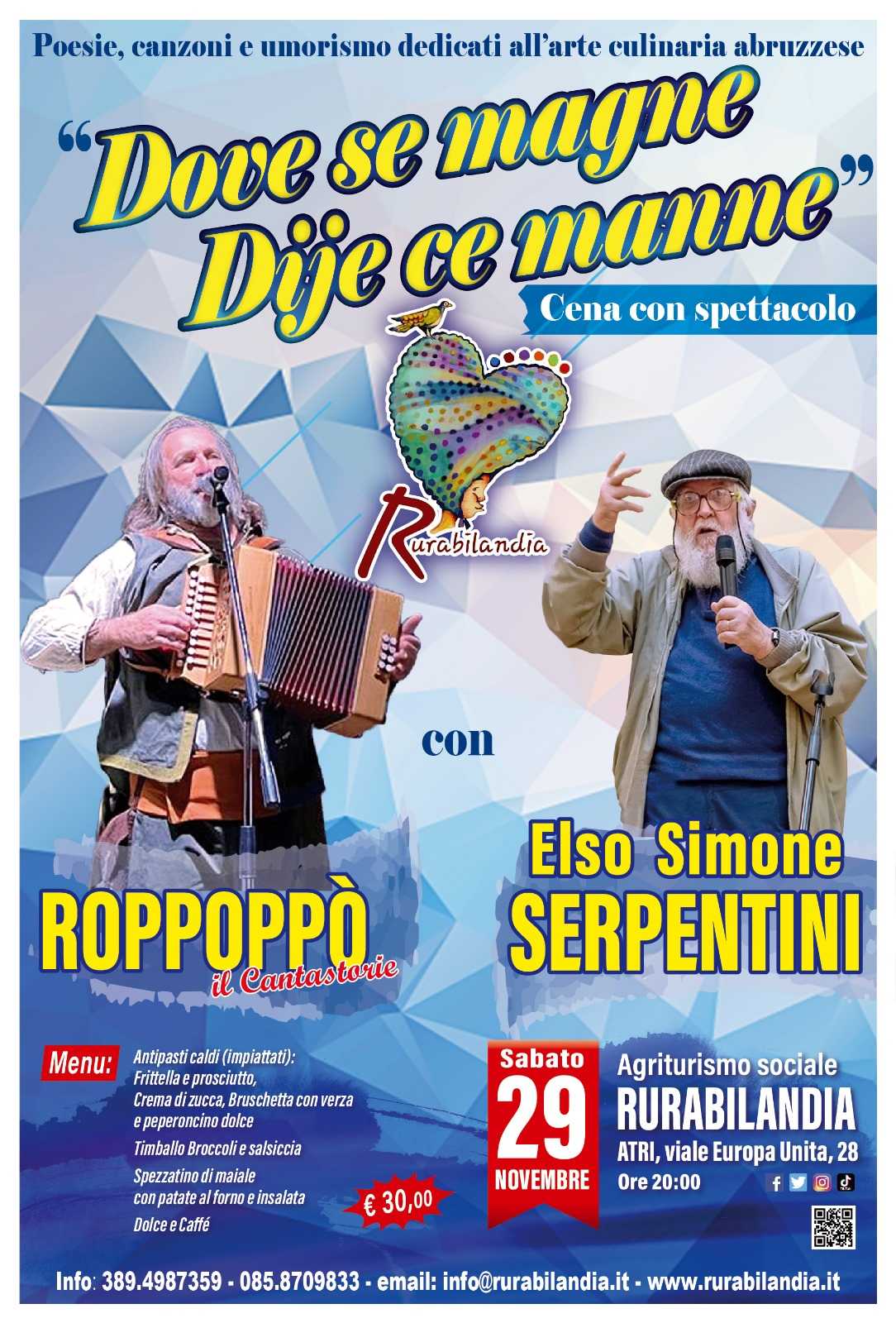 Un evento unico dedicato all’arte culinaria e alla tradizione abruzzese: sabato 29 novembre 2025, “Dove se magne dije ce manne” propone una serata tra poesie, canzoni e umorismo con Elso Simone Serpentini e il cantastorie Roppoppò, accompagnata da un ricco menù tipico ...
