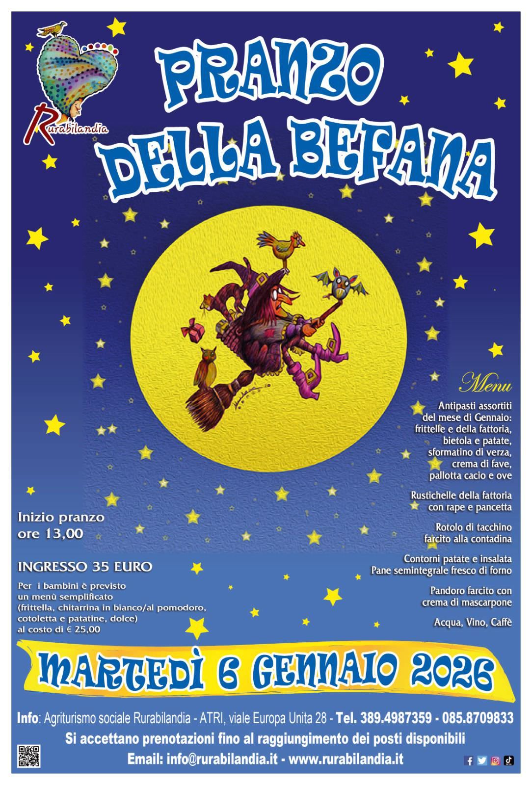 Festeggia l’Epifania a Rurabilandia con il tradizionale Pranzo della Befana: antipasti della fattoria, piatti genuini, pandoro con mascarpone e menù dedicato ai bambini. Ti aspettiamo martedì 6 gennaio 2026 alle ore 13:00.