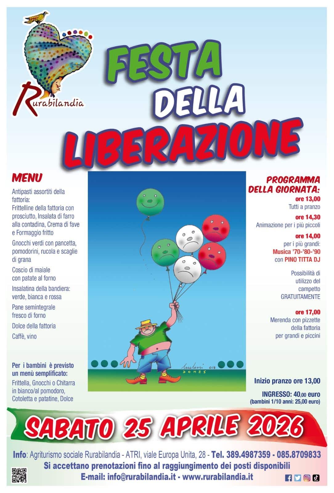 *Per i bambini è previsto un menù semplificato: Frittella con prosciutto, gnocchi in bianco e/o al pomodoro e/o chitarrina, cotoletta, e patatine